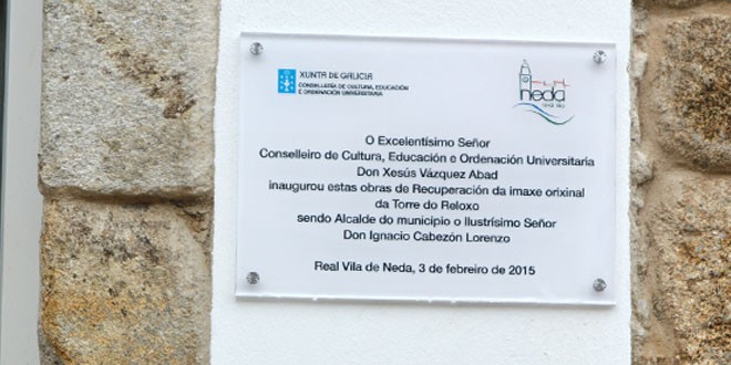 La Torre del Reloj de Neda, sita en un tramo del Camino Inglés a Santiago de Compostela, es una construcción de planta cuadrada que se eleva sobre los edificios contiguos. Construida en cachotería, con piezas de cantería reforzando la fábrica, tiene una puerta con dintel y una ventana de arco apoyado en columnas, y está terminada por un campanario y un reloj que le da nombre. Con esta inversión la Consellería contribuye a la conservación y puesta en valor de este inmueble singular, que ya formaba parte del conjunto constructivo de la Casa-Hospital y capilla del Santo Espíritu hecha por Margarita Fernándes y Pero García en el año 1500. De hecho, esta construcción estaba muy alterada por la pérdida de los recebos y por la presencia de cuadros y cables que suponían un impacto visual no deseado.