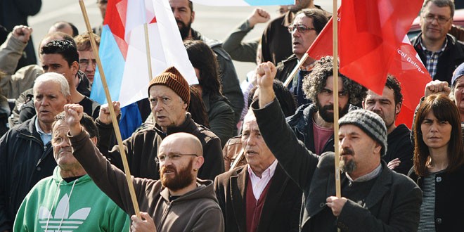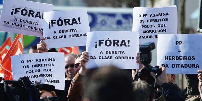 «E para máis inri CC.OO. e UGT incidindo no diálogo social, escenificando como aconteceu hai uns momentos aquí, ante o monumento a Amador e Daniel, sen ningún rubor a súa conivencia e os seus parabens co sistema instaurado transmitindo a mensaxe de que todas e todos queremos o mesmo, que todos estamos no mesmo barco e que todos temos que remar na mesma dirección. Pois non, digámolos claramente a CC.OO. e a UGT que se decate dunha vez, os ricos non queren o mesmo que os pobres. Os que viven do seu traballo non queren o mesmo que os que viven da especulación e a explotación dos traballadores e traballadoras. Os pobos colonizados non queren o mesmo que os seus colonizadores. A clase obreira galega non quere o mesmo que estes que gobernan para as multinacionais, para os bancos e os seus amigos, importándolles moi pouco ou nada a clase traballadora» continuó Manel Grandal.