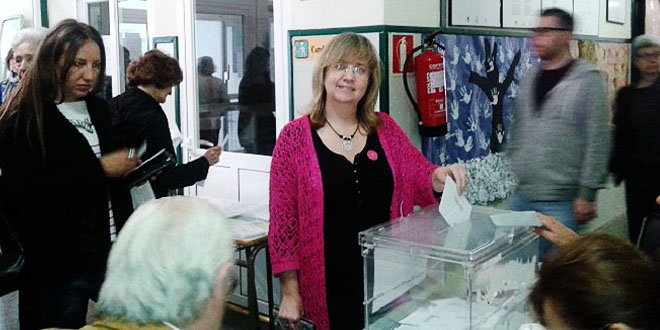 María Consuelo Amado, candidata número uno por UPyD, votó en el colegio de Ponzos, en Ultramar pasadas las doce de la mañana.