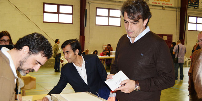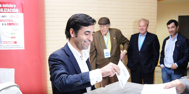 Ya eran las doce y media de la mañana cuando acudió a votar el número dos de la candidatura de los populares, Diego Calvo, acompañado de su hijo.