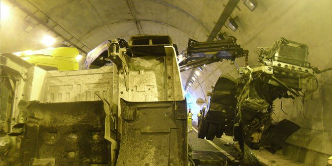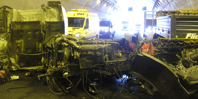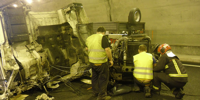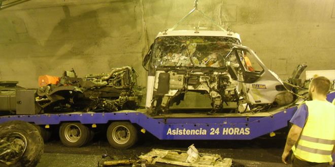 Todo sucedió cuando el camión adelantando a otro, y por causas desconocidas, colisionó contra el «quitamiedos» a unos cincuenta metros del túnel y seguidamente impactó contra la entrada del mismo quedando la cabina partida en tres partes.