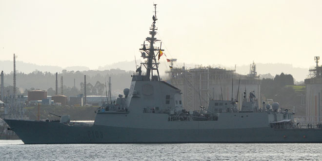 La fragata procedía de Cartagena en donde desembarcó al contingente de Infantería de Marina y al aéreo, con el helicóptero «Toro», después de permanecer casi tres meses fuera de su base ferrolana, integrada en la Agrupación Naval Permanente nº 1 de la OTAN.