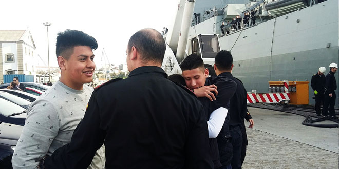 La fragata atracó a los muelles entre el sonar por los altavoces de a bordo música gallega. El contralmirante Pintos, el CN Rodríguez Peña y la comisión de la Armada subieron a bordo y fueron recibidos por el comandante Arcos palacios.