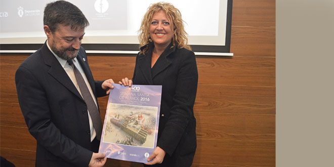 Pasadas las doce de la mañana de este sábado, día 13, se celebró el acto de presentación del cartel anunciador de la Semana Santa 2016, en el salón de actos del edificio del antiguo Hospicio bajo la presidencia del Administrador Diocesano, Antonio Rodríguez Basanta; la primera teniente alcalde, Beatriz Sestayo y el presidente de la Junta General de Cofradías y Hermandades, César Carreño.