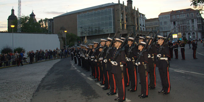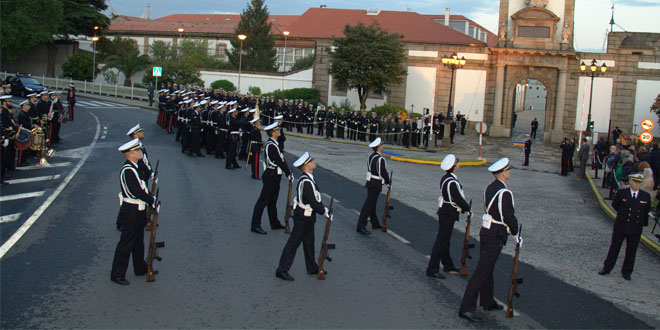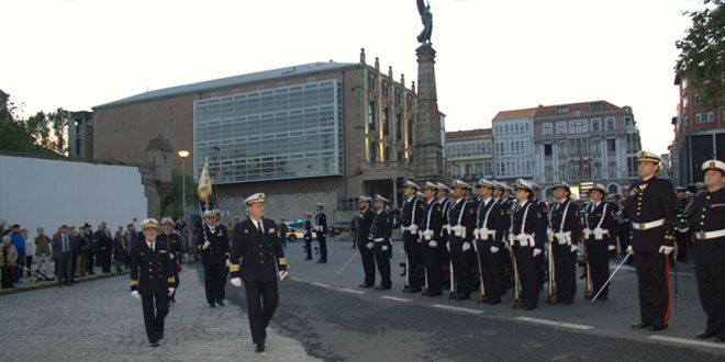 Momentos antes de la hora fijada llegaron ante la Puerta del Dique, desfilando desde el Cuartel de Dolores, en Batallones, por la avenida de Irmandiños, la Unidad de Música del Tercio del Norte y una compañía de honores formada por una escuadra de gastadores, una sección de la Escuela de Especialidades «Antonio de Escaño» y otra de Infantería de Marina del Tercio del Norte, al mando del Teniente de Navío José Antonio Lozano, quien dio la novedad al Ayudante Mayor del Arsenal Capitán de Fragata Pedro Viñas Pampillo.