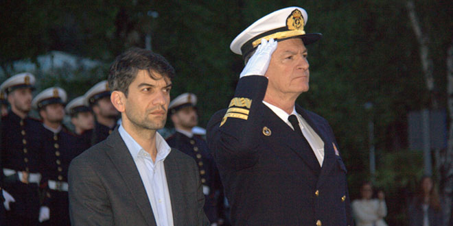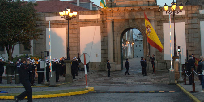 El almirante Jefe del Arsenal Militar de Ferrol, Vicealmirante Francisco Javier Romero Caramelo acompañado por el alcalde de la ciudad, Jorge Suárez Fernández y una amplia representación de la Armada, presidió en la tarde-noche de este miércoles, día 25, el acto del solemne arriado de la Bandera Nacional en el edificio de entrada a las dependencias militares del Arsenal, con motivo del Día de las Fuerzas Armadas y que sirve como broche a la serie de actividades que se están desarrollando durante toda esta semana.