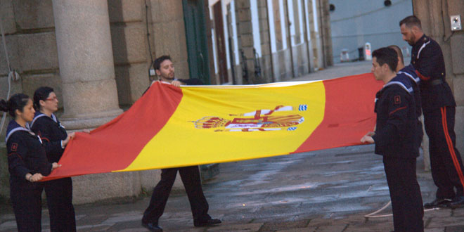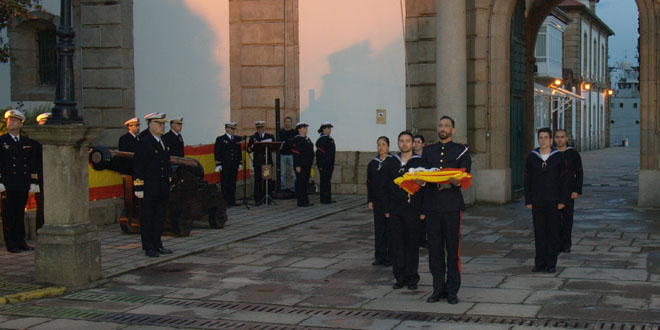 A las 22,02 horas a la señal de cañón desde la «Punta del martillo» (tradicional «cañonazo» como se viene haciendo desde hace más de cien años) se arriaron las Banderas en los buques y dependencias de la Armada y en la Puerta del Dique mientras la Unidad de Música del Tercio del Norte interpretaba el Himno Nacional y las secciones rendían honores.
