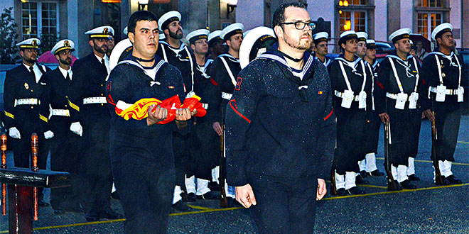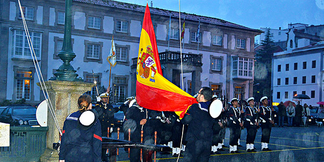 El acto comenzó a las 21.15 horas con el desfile de una sección de honores compuesta por miembros de la Escuela de Especialidades “Antonio de Escaño” y la unidad de música del Tercio del Norte de Infantería de Marina, que partieron del atrio de la iglesia de San Francisco y recorrieron la calle del mismo nombre y la calle Real, hasta ocupar sus puestos para la ceremonia, en las inmediaciones del mástil de la Bandera en los Jardines de Herrera.