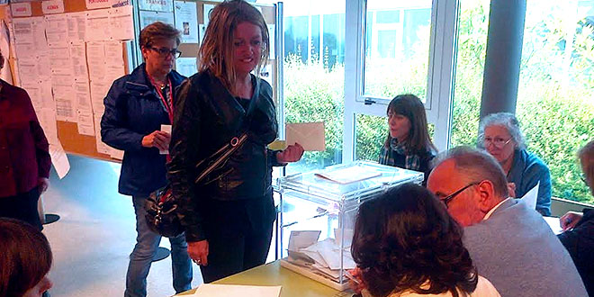 A la misma hora, pero en la Escuela de Idiomas depositaba su voto la parlamentaria gallega y secretaria xeral de la ejecutiva local del PSdG-PSOE Beatriz Sestayo.