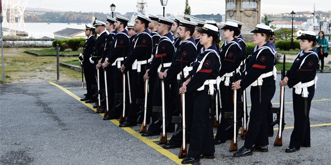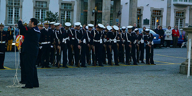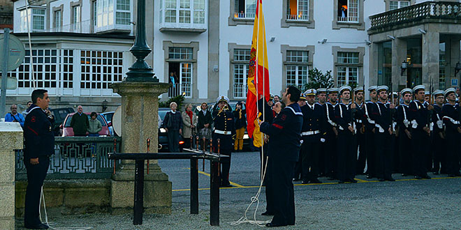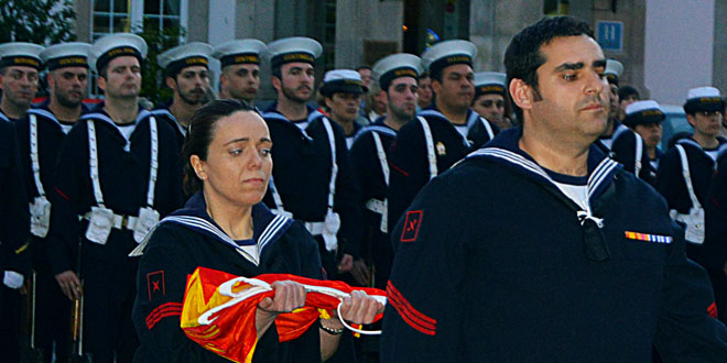 El acto comenzará a 21,45 horas con el desfile de una Sección de Honores compuesta por miembros de la Fuerza de Acción Marítima de Ferrol y la unidad de música del Tercio del Norte, que partieron del atrio de la iglesia castrense de San Francisco y recorrieron la calle del mismo nombre y la calle Real, hasta ocupar sus puestos para la ceremonia, en las inmediaciones del mástil de la Bandera en los Jardines de Herrera.