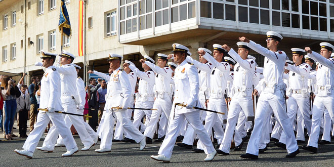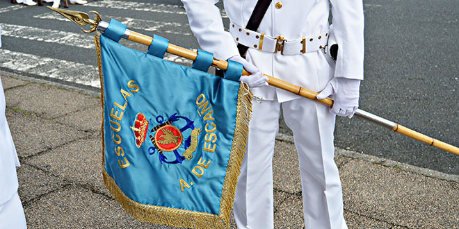 Para finalizar el acto, y antes del desfile de todas las fuerzas ante las autoridades, el comandante-director de la Escuela “Antonio de Escaño”, Capitán de navío Manuel Romasanta Pavon se dirigió a todos los presentes tras agradecer la nueva visita a la escuela del contralmirante Gamboa.