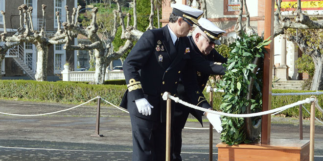Seguidamente se procedió al Homenaje a los que dieron su vida por España, con un recuerdo especial a los que formaron parte en la Especialidad, profesora y alumnos “que ya no están con nosotros” Mientras la banda del Tercio del Norte interpretaba “la muerte no es el final” el almirante Rosique acompañado por el subteniente Gerardo Eguren, “el más antiguo de la especialidad a bordo” depositaban una corona de laurel ante una Cruz situada en un lateral de la explanada. El sacerdote castrense de la Escuela entonó una oración por todos los Caidos. Al final, tras el toque de oración se escucho una descarga de fusilería realizada por la sección de la ESENGRA.