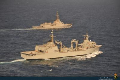 El buque de aprovisionamiento de combate ‘Cantabria’, que navega rumbo a Australia, y la fragata ‘Méndez Núñez’, participante en la Operación “Atalanta”, se encontraron el sábado pasado en el Golfo de Adén para realizar aprovisionamiento y petroleo en la mar. El aprovisionamiento consistió en el traspaso de 44 palés de alimentos y material diverso necesario para la navegación. Para ello, …