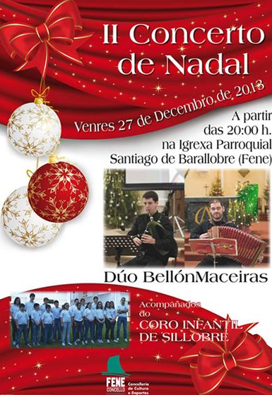 La Iglesia Parroquial Santiago Apóstol de Barallobre, en Fene, acoge este viernes, día 27, a las 20.00 el II " Concierto de Nadal a cargo del Dúo Bellón -Maceiras, acompañado por el Coro Infantil de Sillobre. En el concierto el Dúo Bellón-Maceiras presentará un repertorio de villancicos gallegos y de otros países que ya tuvieron ocasión de presentar en Moscú. El concierto …