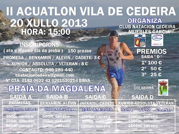La villa celebrará este sábado, día 20 , la segunda edición del Acuatlón Vila de Cedeira. Organizado por el Club Natación Cedeira-Muebles García, y cuenta con la colaboración del Ayuntamiento que preside Leopoldo Rubido. La prueba dará comienzo a las 15 horas, con punto de salida en la playa de la Magdalena y las personas interesadas en anotarse podrán hacerlo …