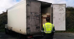 Componentes del Destacamento de la Guardia Civil de Tráfico de Ferrol, durante el desarrollo de un dispositivo de control de exceso de peso, en el peaje de la autopista AP9F, a la altura del km. 25,200,en Vilar do Colo-Fene, procedieron a controlar a un camión que realiza un transporte de alimentos frescos y productos congelados, para establecimientos chinos, desde Madrid …