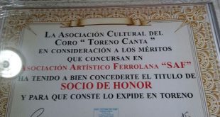 El portavoz y relaciones públicas de la Sociedad Artística Ferrolana, Antonio Ruibal (Caruso), se ha trasladado a Toreno, localidad de la comarca del Bierzo cercana a Ponferrada en donde recogió el título de Socio de Honor concedido a la SAF por la Asociación Cultural del Coro "Toreno Canta". El título fue entregado por la poeta y escritora Pilar Puente Rego, Presidenta …
