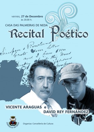 La Casa das Palmeiras acogerá este viernes 27 de diciembre, un recital poético a cargo de Vicente Araguas y David Rey Fernández. El evento, organizado por la Concejalía de Cultura del municipio de Neda, dará comienzo a las 20 horas siendo su entrada libre y gratuita.