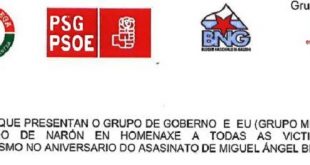 O tripartito naronés –TEGA, PSOE e BNG- e EU presentaron unha moción conxunta no pleno celebrado na mañá deste xoves para homenaxear a todas as vítimas do terrorismo no aniversario do asasinato de Miguel Ángel Blanco. O documento contou tamén co respaldo dos cinco edís do PP e do de ENE, quedando aprobado por unanimidade. En base a esta moción, …