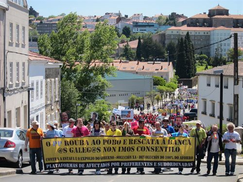 Más de un millar de afectados por las participaciones preferentes y las subordinadas han recorrido este sábado, día 25, diversas calles de Santiago de Compostela para exigir al Gobierno "voluntad política" para que les devuelvan sus ahorros y que España pida a Europa el "dinero suficiente" para que sea la banca y no los afectados "quien pague el rescate". "Lo que …