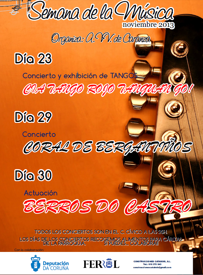 Un año más la asociación de vecinos de Caranza organiza la Semana de la música, en esta ocasión en su XXVIII edición. Con la colaboración del Concello de Ferrol y la Diputación de A Coruña, la asociación vecinal organiza tres días de conciertos en el salón de actos del Centro Cívico a las 20 horas. Comienzan este sábado día 23, con un concierto de Tangos …